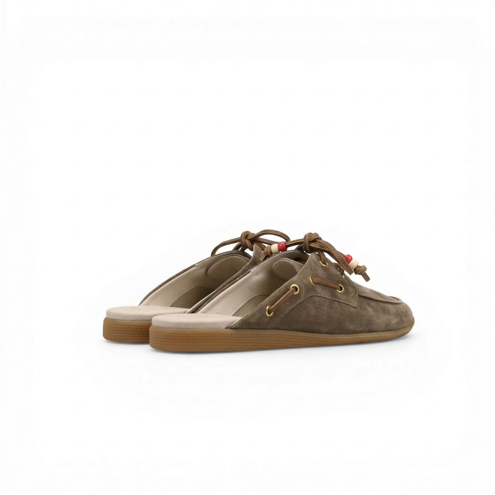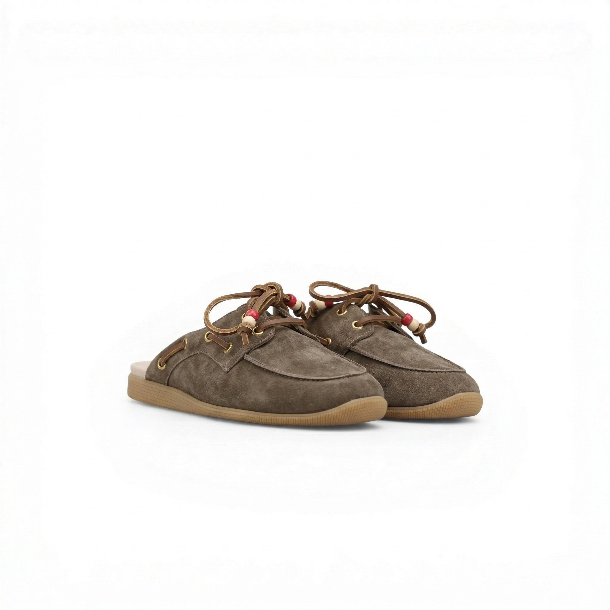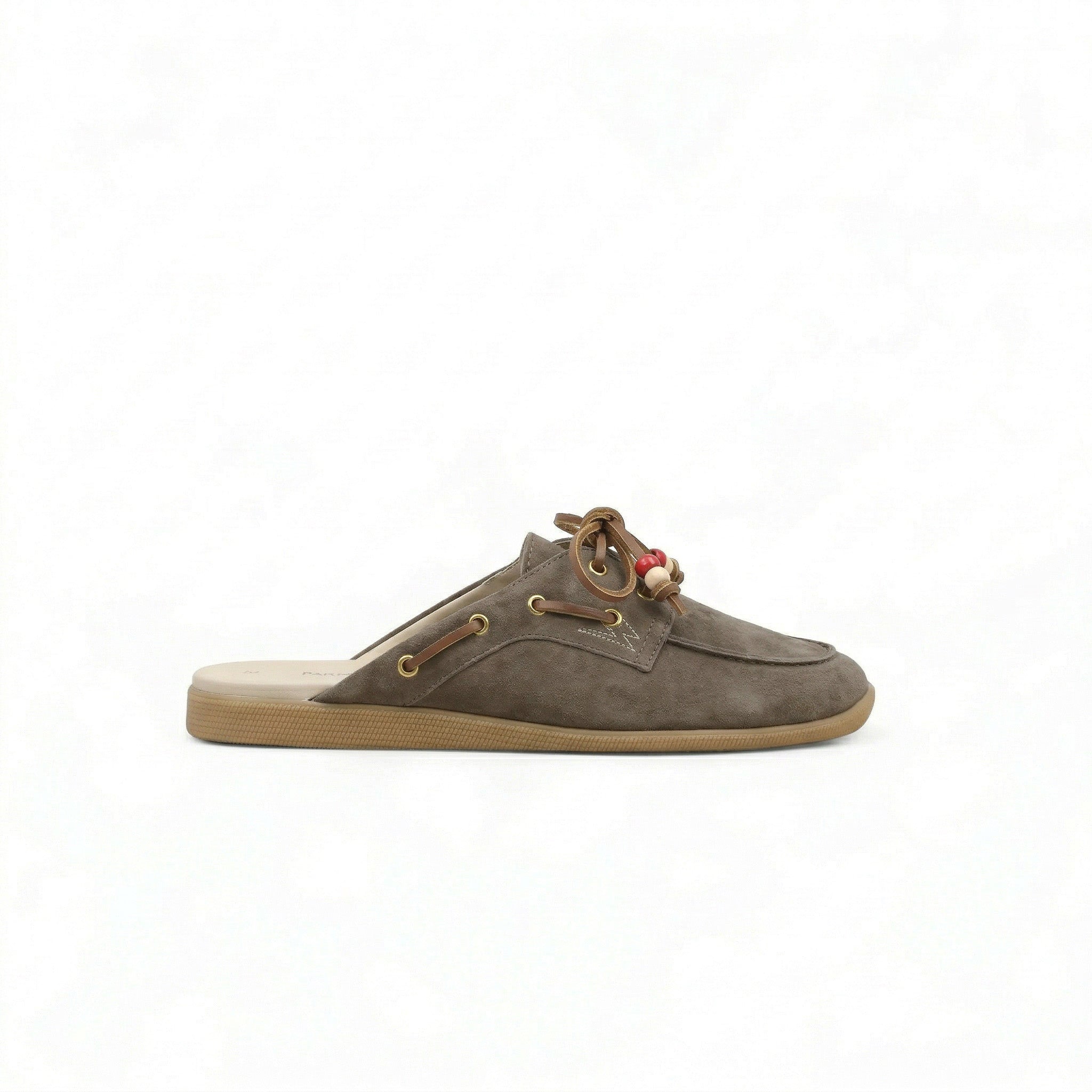 Mules da barca da donna made in Italy in suede stampato radica, con perline colorate. - Suola in gomma ambra- Suola alta 1,7 cm - Lacci in cuoio marrone - Fodera in pelle- Soletto in pelle- Calzata regolare