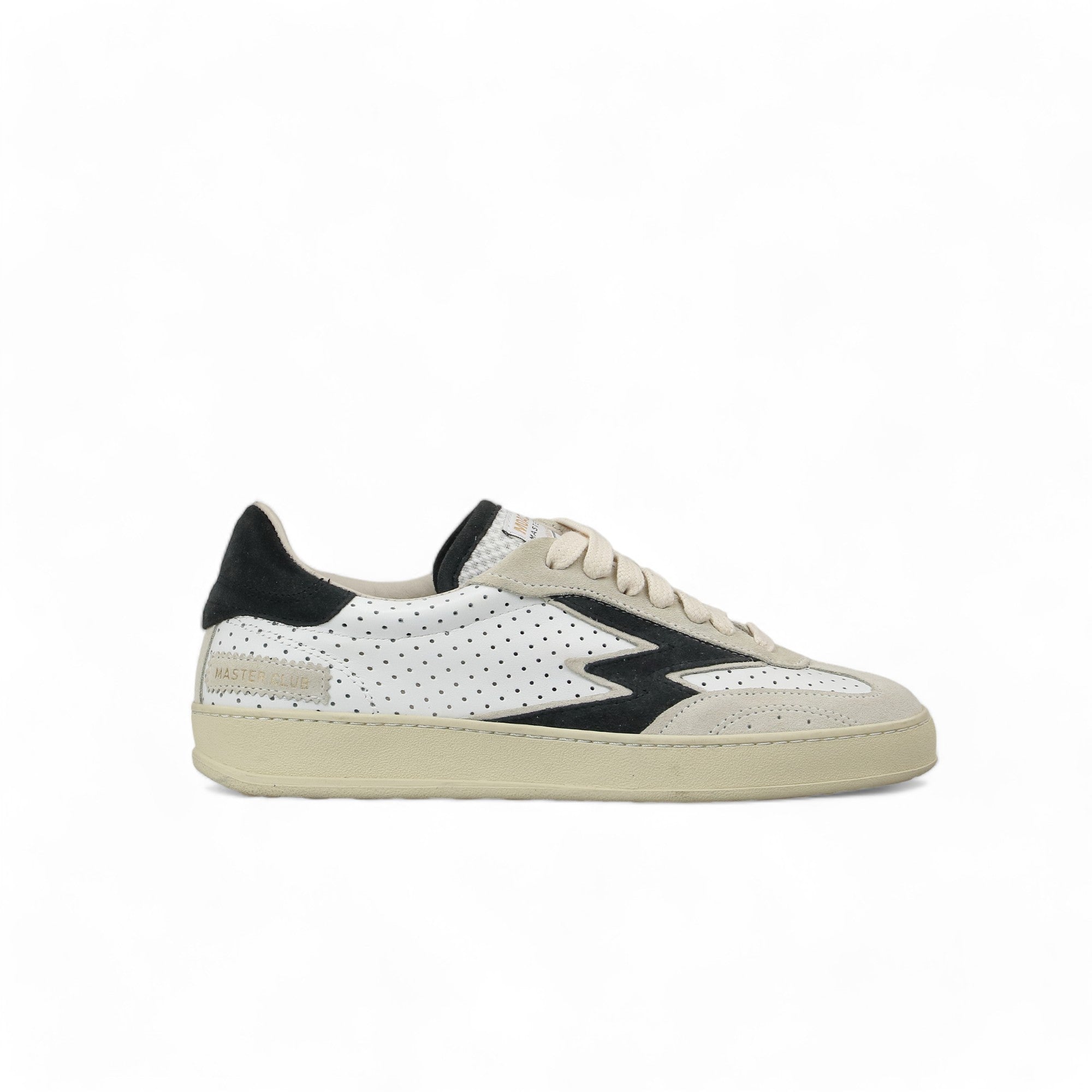 Sneakers da donna bianche basse made in Italy in pelle traforata, con dettagli in suede off white e logo in suede nero - Logo in suede nero - Linguetta in mesh bianco - Suola in gomma burro - Suola alta 3,4 cm - Lacci in cotone off white - Backtab in suede nero - Sfoderata - Soletto in pelle - Calzata regolare
