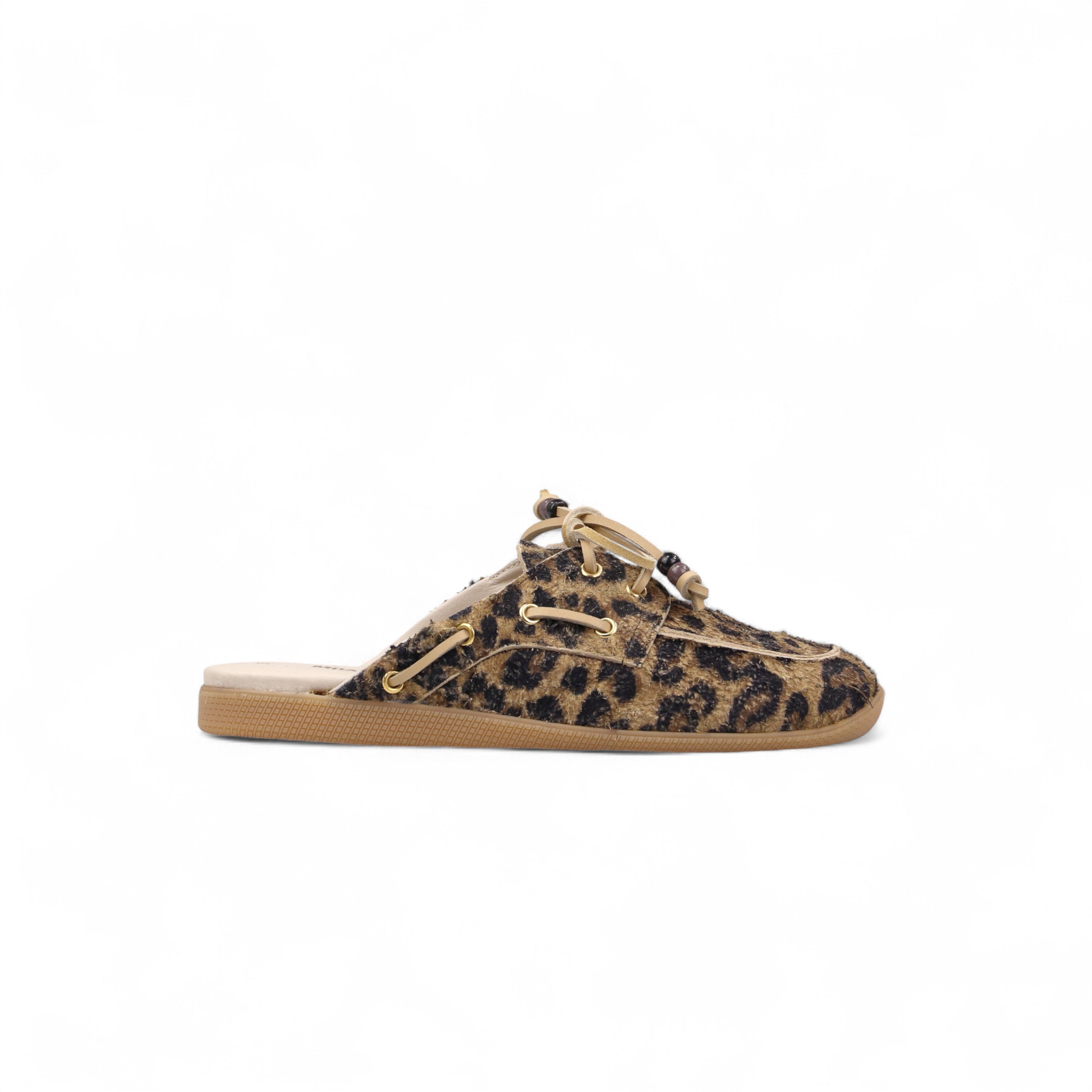 Mules da barca da donna made in Italy in suede graffiato stampato leopardo, con perline colorate. - Suola in gomma ambra- Suola alta 1,7 cm - Lacci in cuoio marrone - Fodera in pelle- Soletto in pelle- Calzata regolare