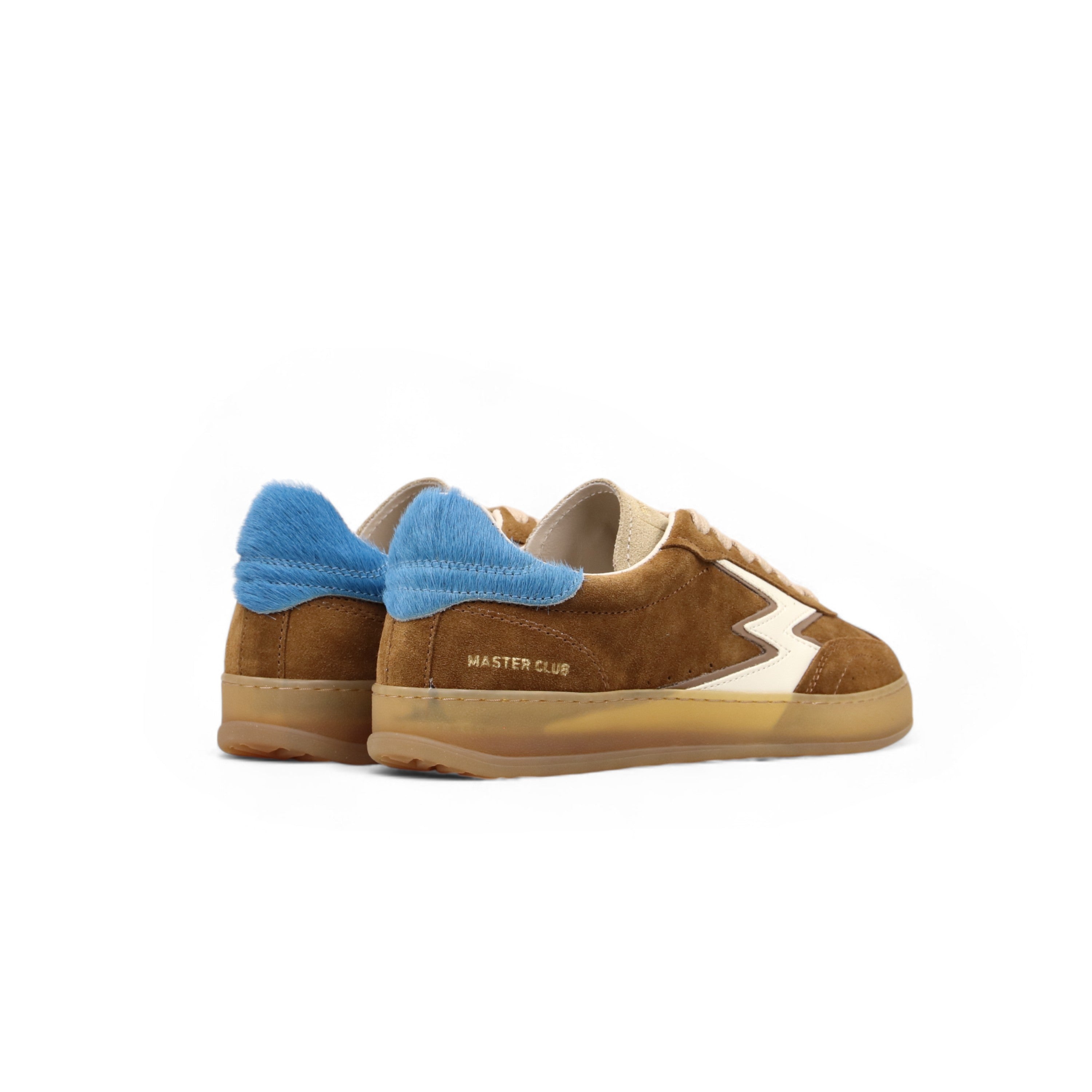 Women's low-top tobacco sneakers made in Italy in suede, with white leather logo and turquoise pony skin backtab. - White leather logo - Sand suede tongue - Honey rubber sole - 3.4 cm high sole - Beige cotton laces - Turquoise pony skin backtab - Fabric lining - Leather insole - Regular fit NB Ponyskin and suede are delicate materials, we recommend treating sneakers with care