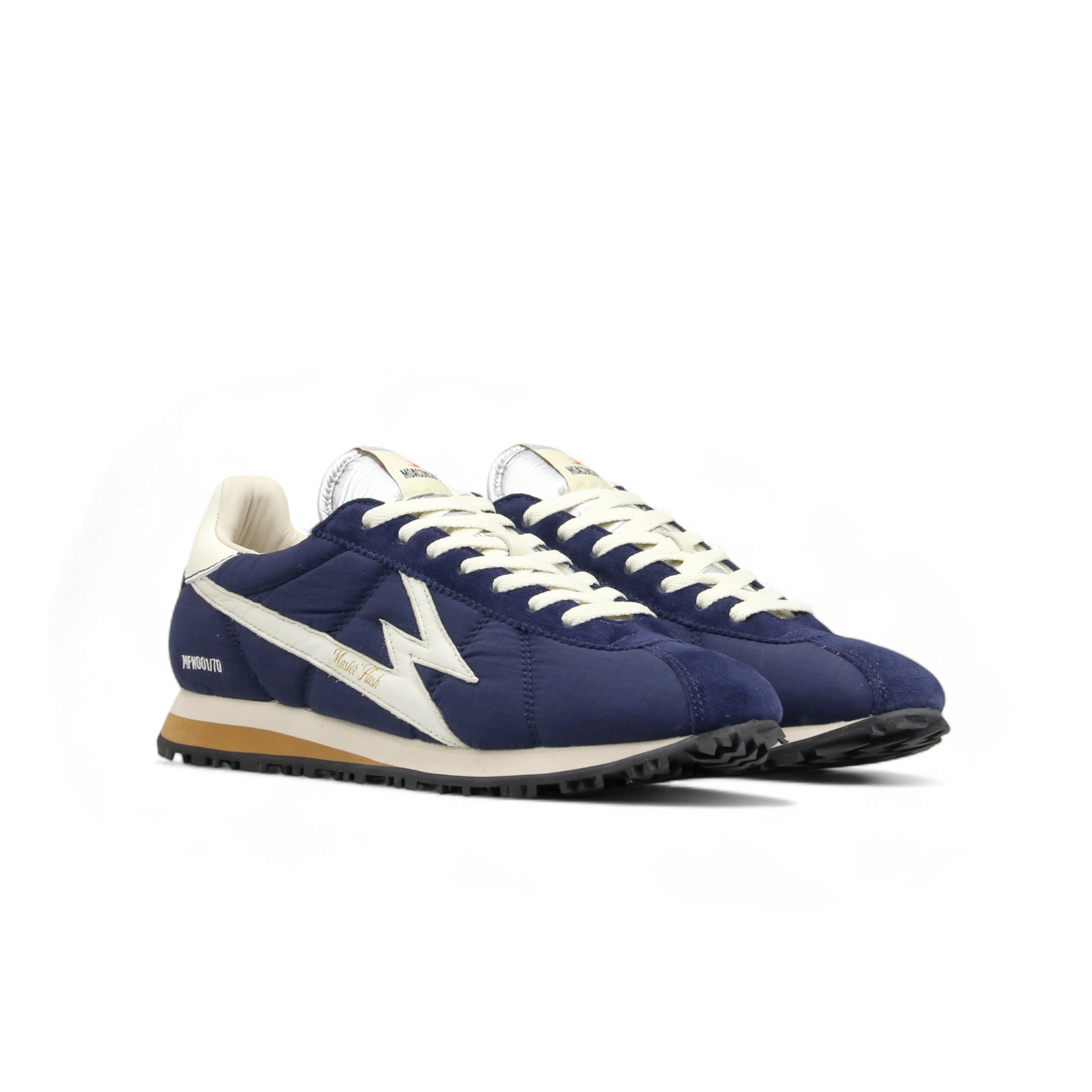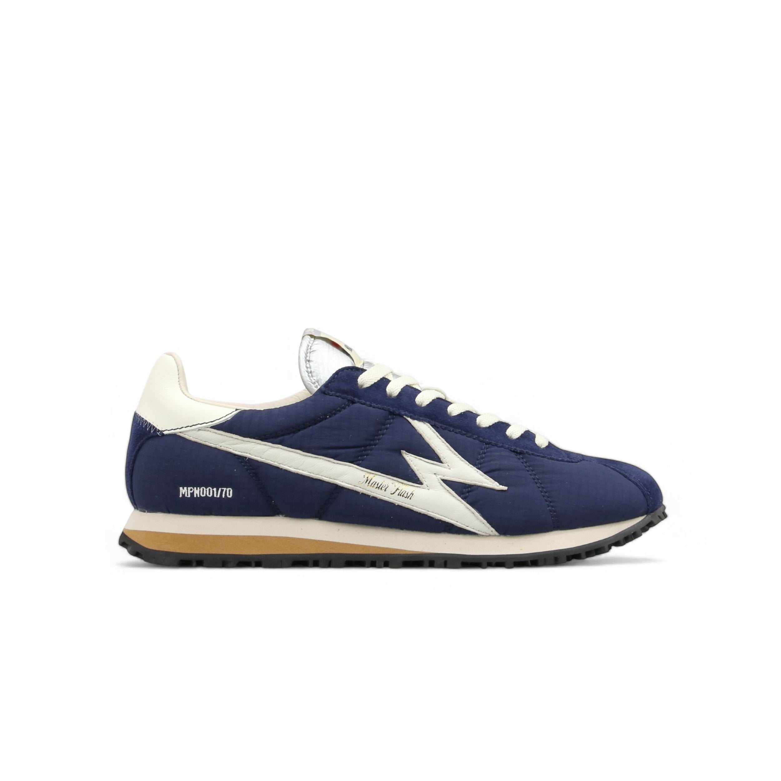 Unisex low-top navy blue nylon sneakers with white leather and navy blue suede details. - White leather logo - Silver nylon tongue - Two-tone EVA sole and rubber tread - 2.8 cm high sole - White cotton laces - White leather backtab - Leather lining - Canvas insole - Regular fit