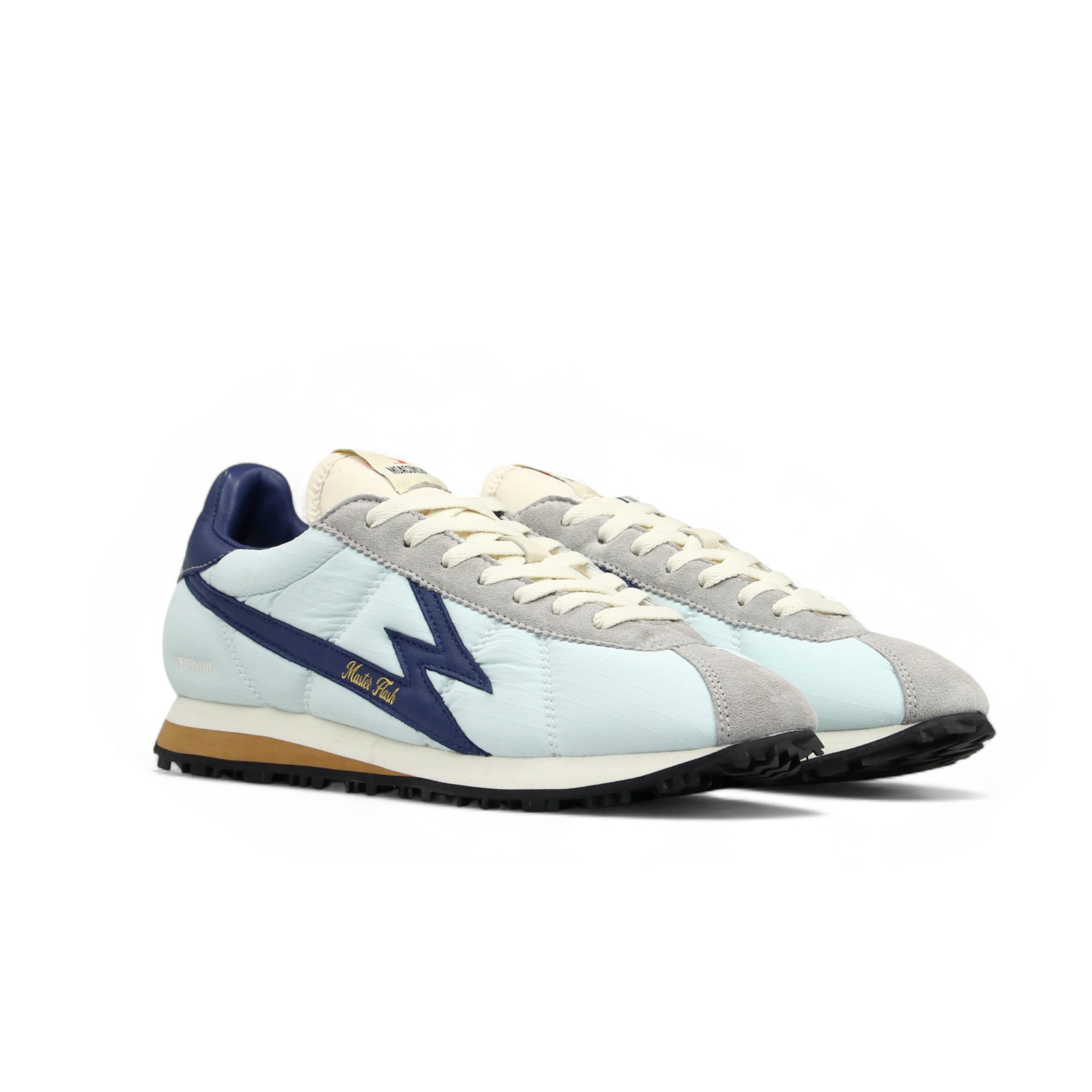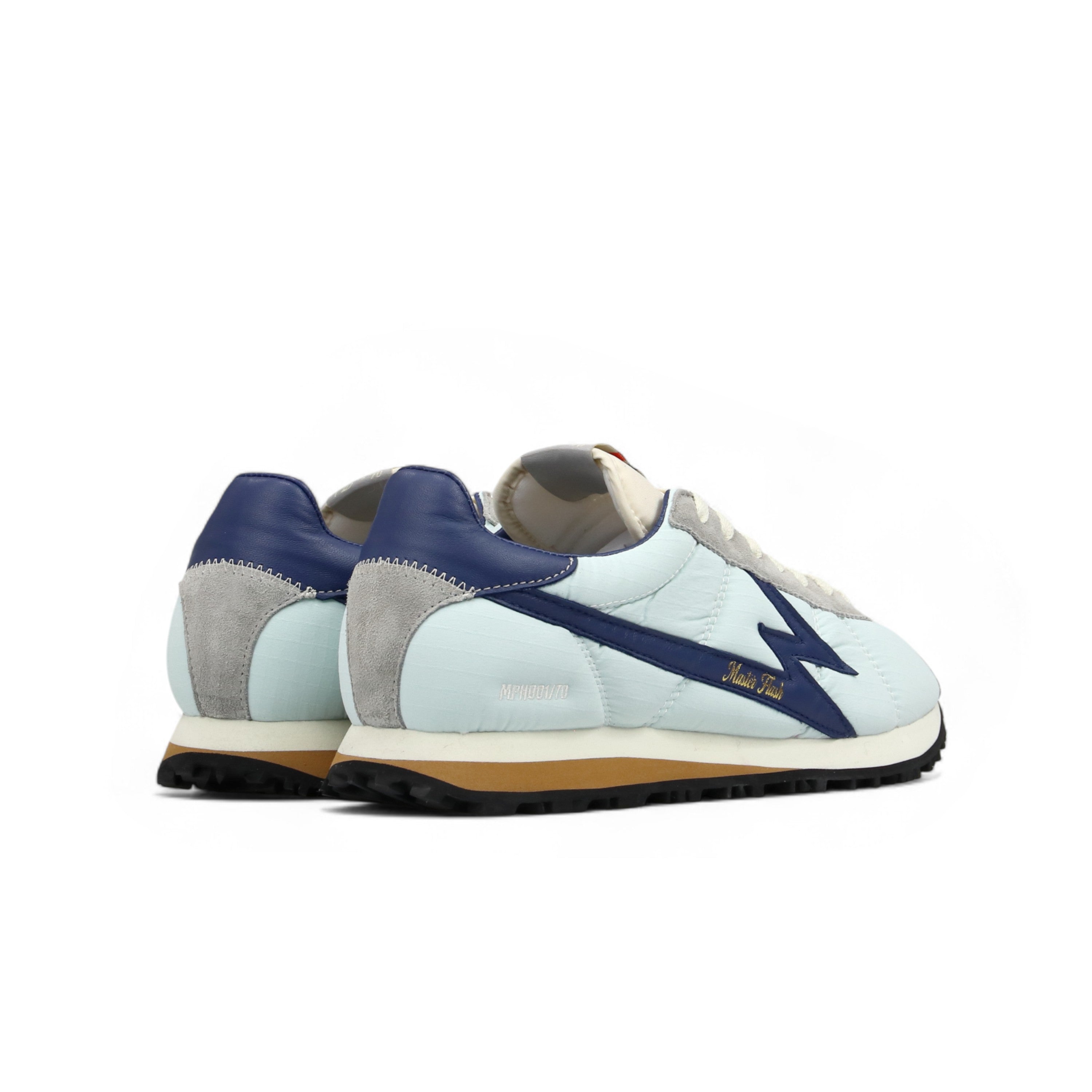 Unisex low-top navy blue nylon sneakers with pastel blue leather and grey suede details. - Pastel blue leather logo - Off-white nylon tongue - Two-tone EVA sole and rubber tread - 2.8 cm high sole - White cotton laces - Pastel blue leather backtab - Leather lining - Canvas insole - Regular fit
