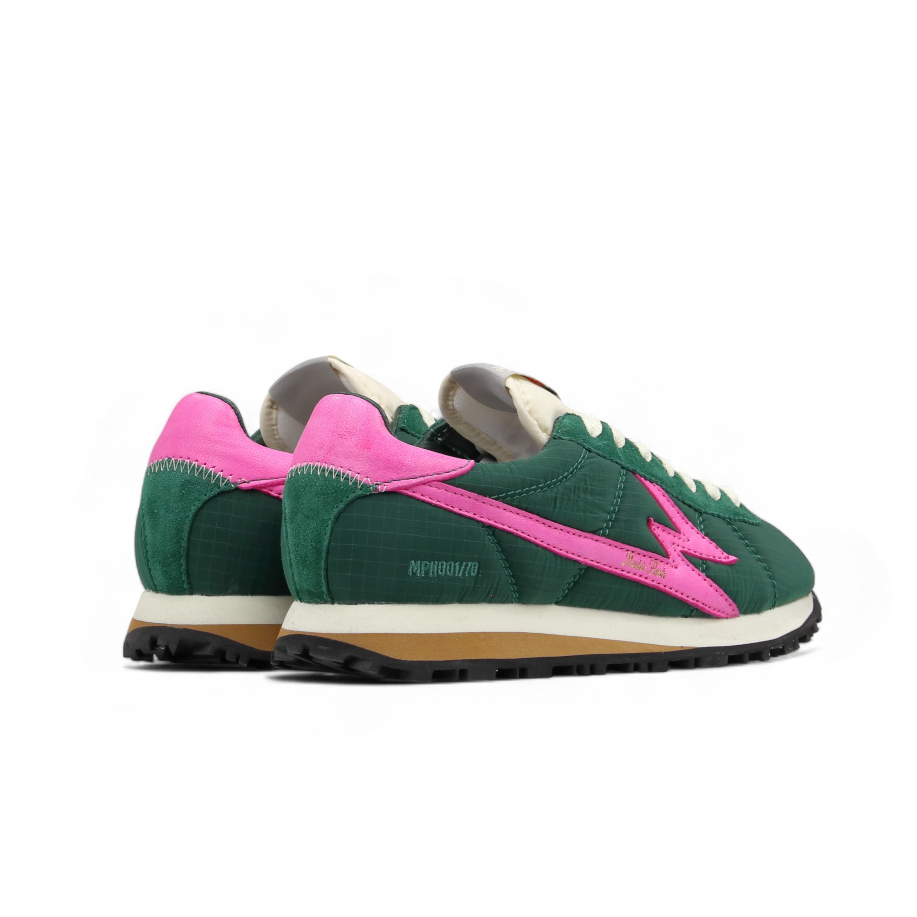 Low-top green unisex sneakers in nylon, with fuchsia leather and green suede details. - Fuchsia leather logo - Off-white nylon tongue - Two-tone EVA sole and rubber tread - 2.8 cm high sole - White cotton laces - Fuchsia leather backtab - Leather lining - Canvas insole - Regular fit