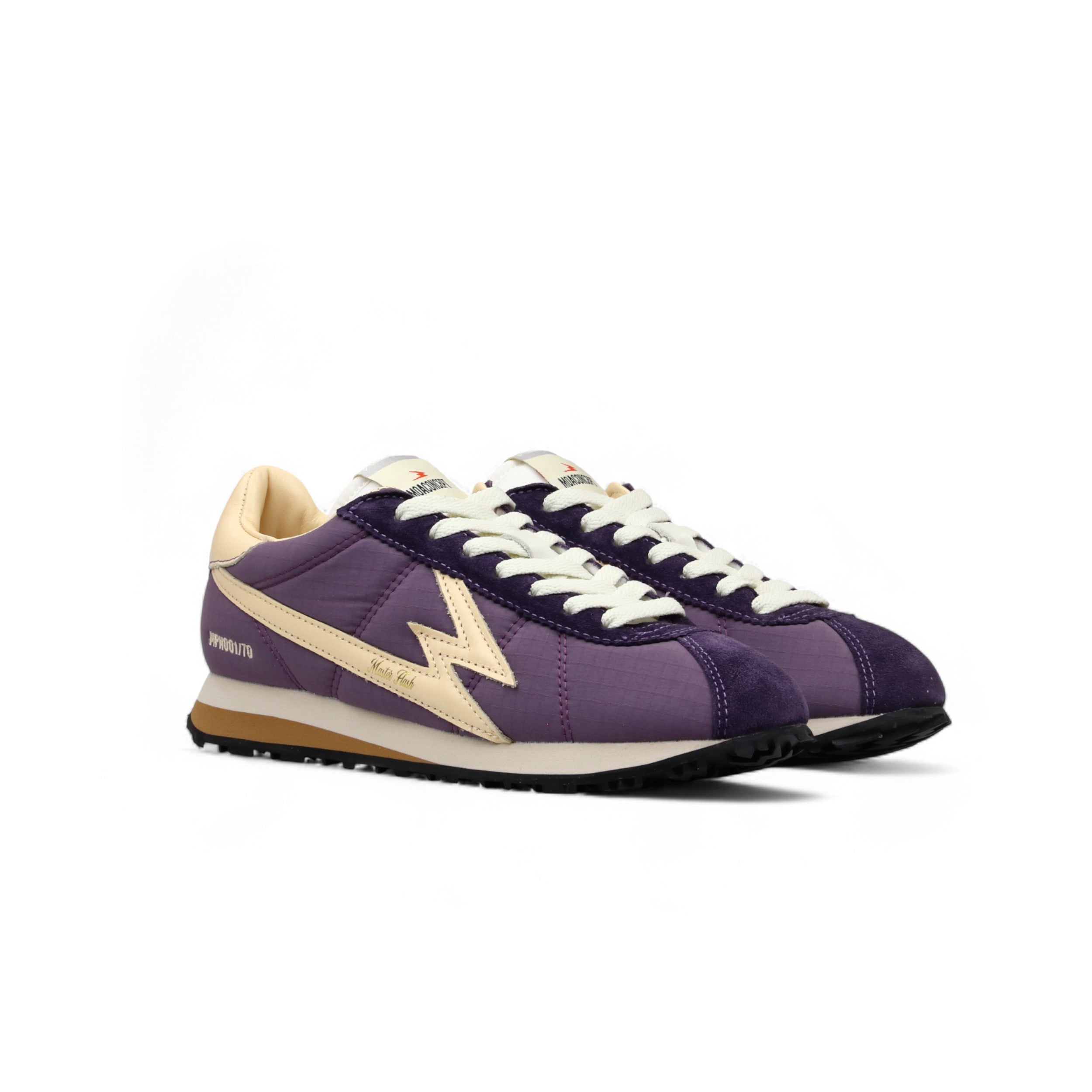 Women's low-top purple nylon sneakers with butter-colored leather and purple suede details. - Butter leather logo - White nylon tongue - Two-tone EVA sole and rubber tread - 2.8 cm high sole - White cotton laces - Butter leather backtab - Leather lining - Canvas insole - Regular fit