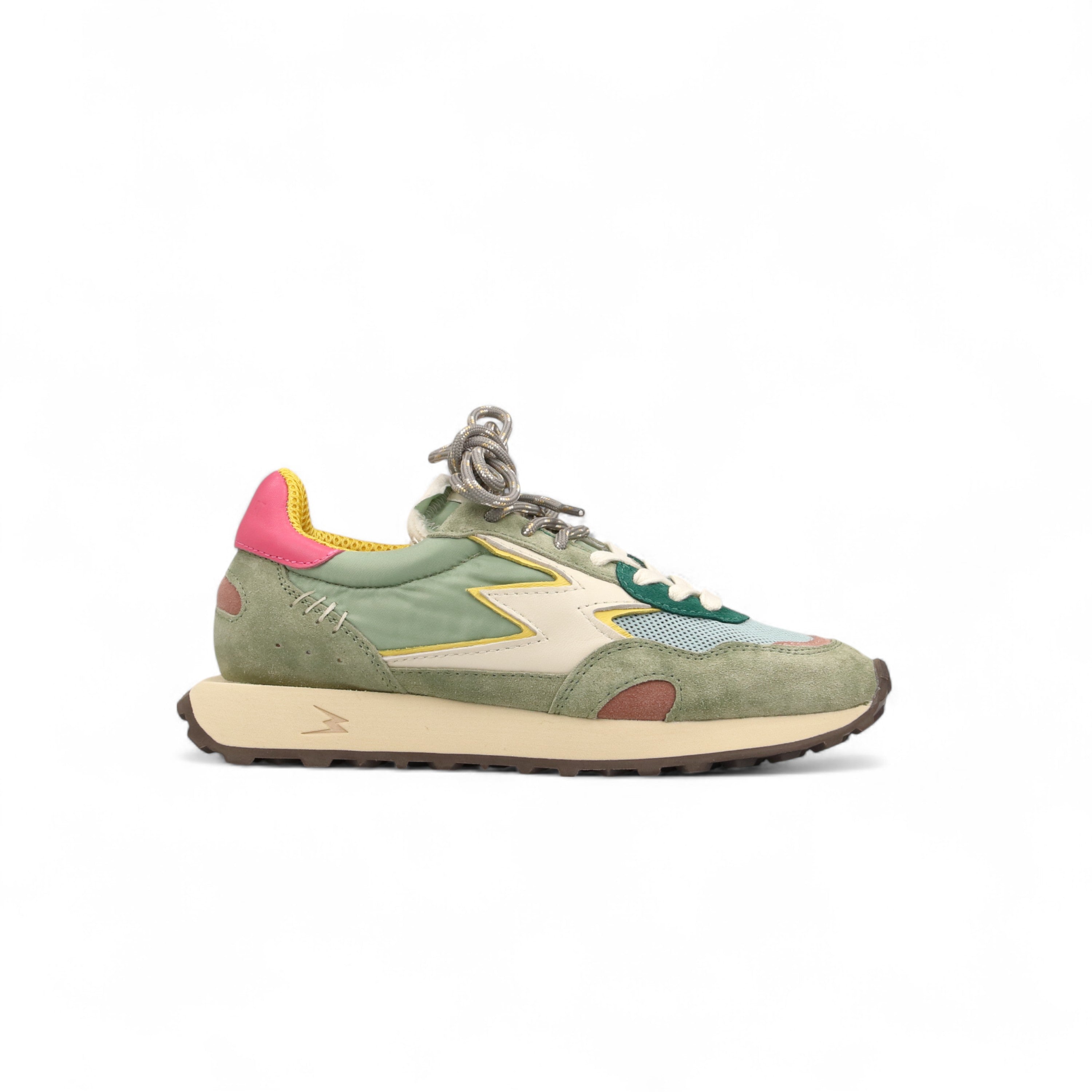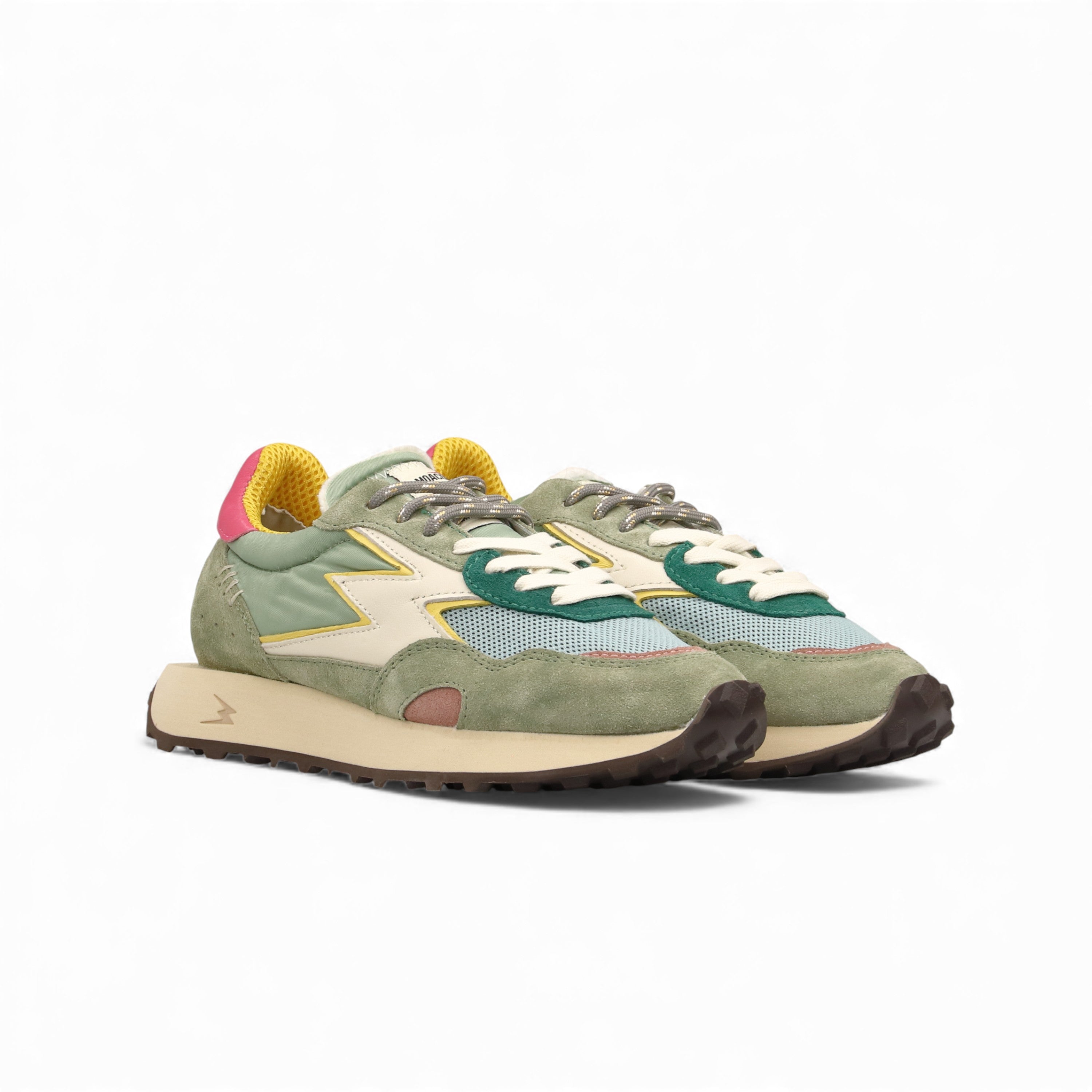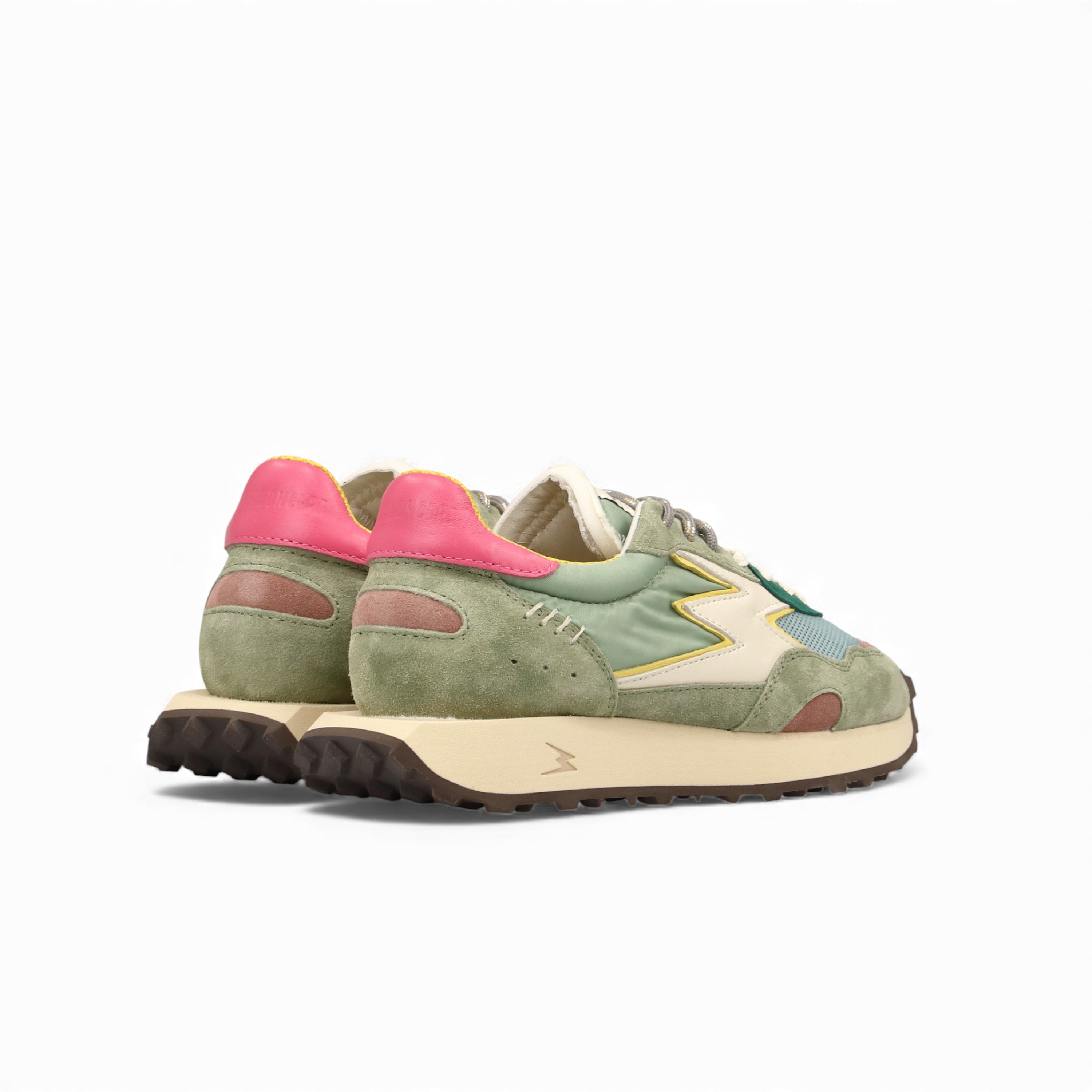 Unisex low-top matcha green sneaker designed in Italy in sage green washed nylon and suede with yellow and fuchsia pink leather details and white hammered leather logo. - White hammered leather logo - Matcha green nylon tongue - Two-tone sole in vanilla EVA and black rubber - 3.2 cm high sole - Double lace in off-white cotton and grey trekking - Fuchsia leather backtab - Yellow fabric lining - Canvas insole - Regular fit NB Suede and rubberized leather are delicate materials, we recommend treating sneakers with care