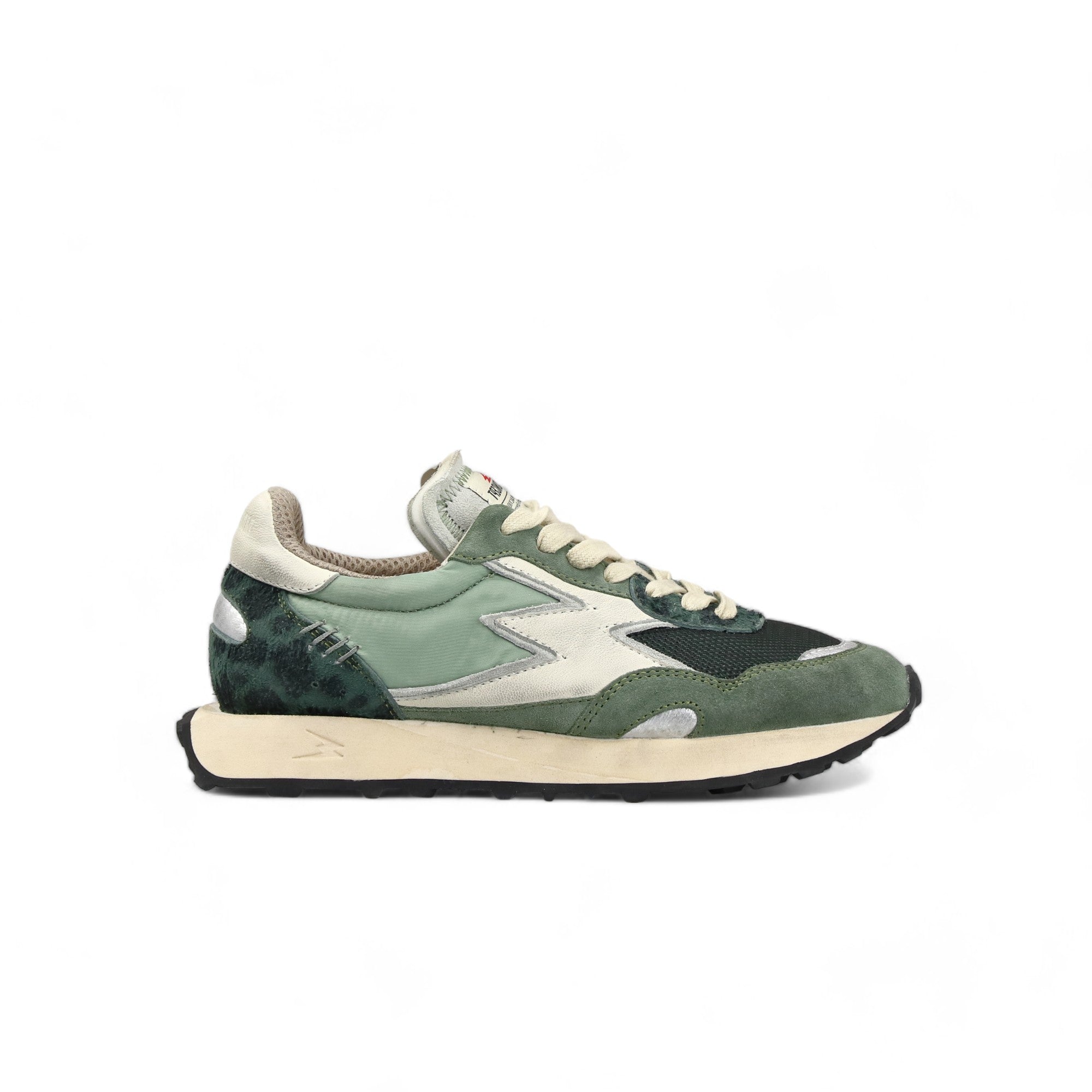 Women's low-top matcha green sneakers designed in Italy in nylon and mesh, with green leopard print scratched suede details and off-white leather logo, distressed effect - Off-white leather logo - Off-white suede tongue - Two-tone sole in vanilla EVA and black rubber - 3.2 cm high sole - Ivory cotton laces - Off-white leather backtab - Fabric lining - Canvas insole - Regular fit