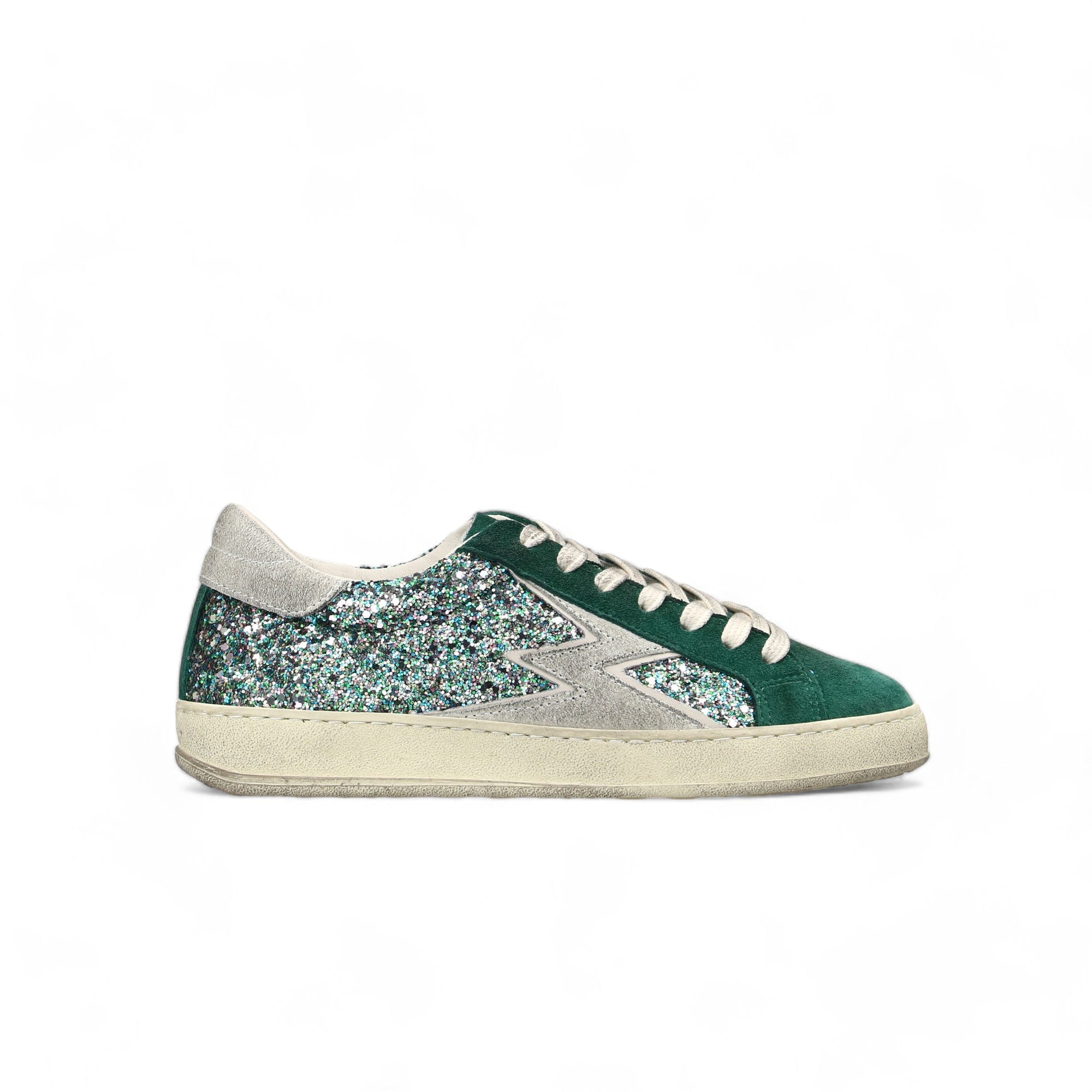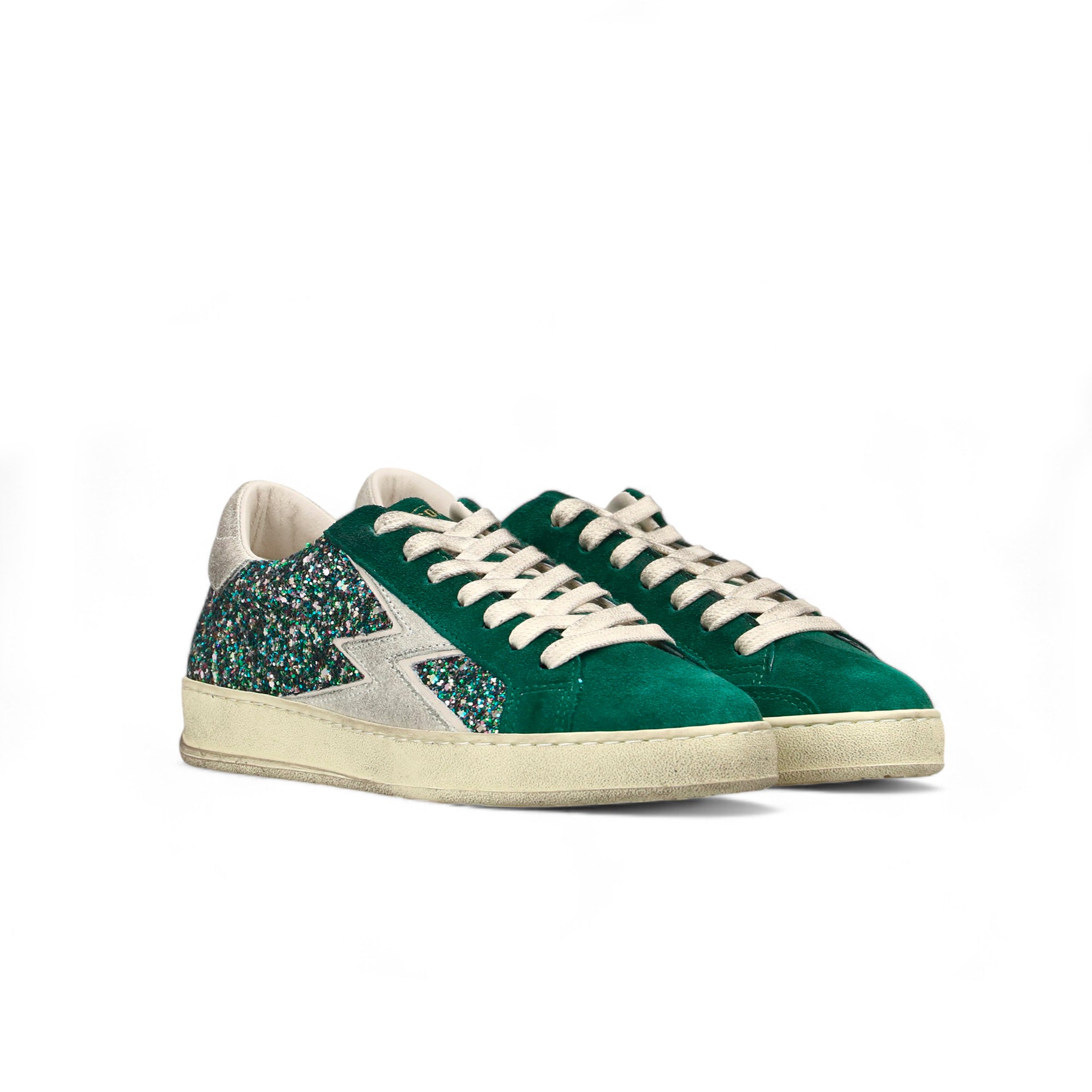 Women's low-top sneakers in suede and green glitter made in Italy, with details in light grey suede with a dirty effect and green suede. Iconic De Luxe version - Light grey suede logo with dirty effect - Green suede tongue - Butter rubber sole with dirty effect - 3.4 cm high sole - Ivory cotton laces with a dirty effect - Backtab in light grey suede with a dirty effect - Fabric lining - Leather insole - Regular fit