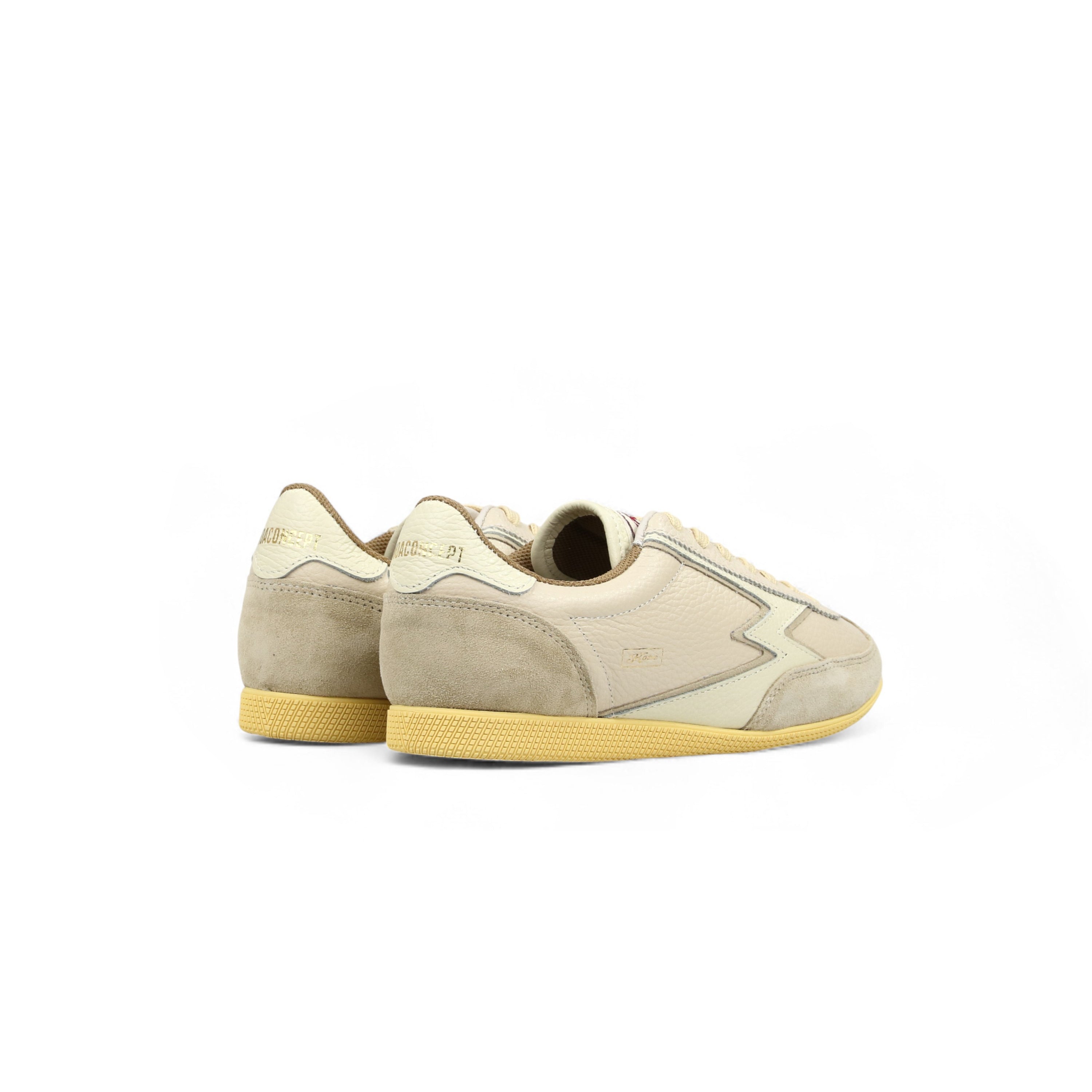 Women's low-top sneakers made in Italy in beige hammered synthetic leather, with beige suede details, logo and backtab in off-white hammered synthetic leather. - Off-white hammered synthetic leather logo - Hammered synthetic leather tongue - Yellow rubber sole - 1.7 cm high sole - Beige polyester laces - Off-white hammered synthetic leather backtab with gold print - Fabric lining - Leather insole - Regular fit