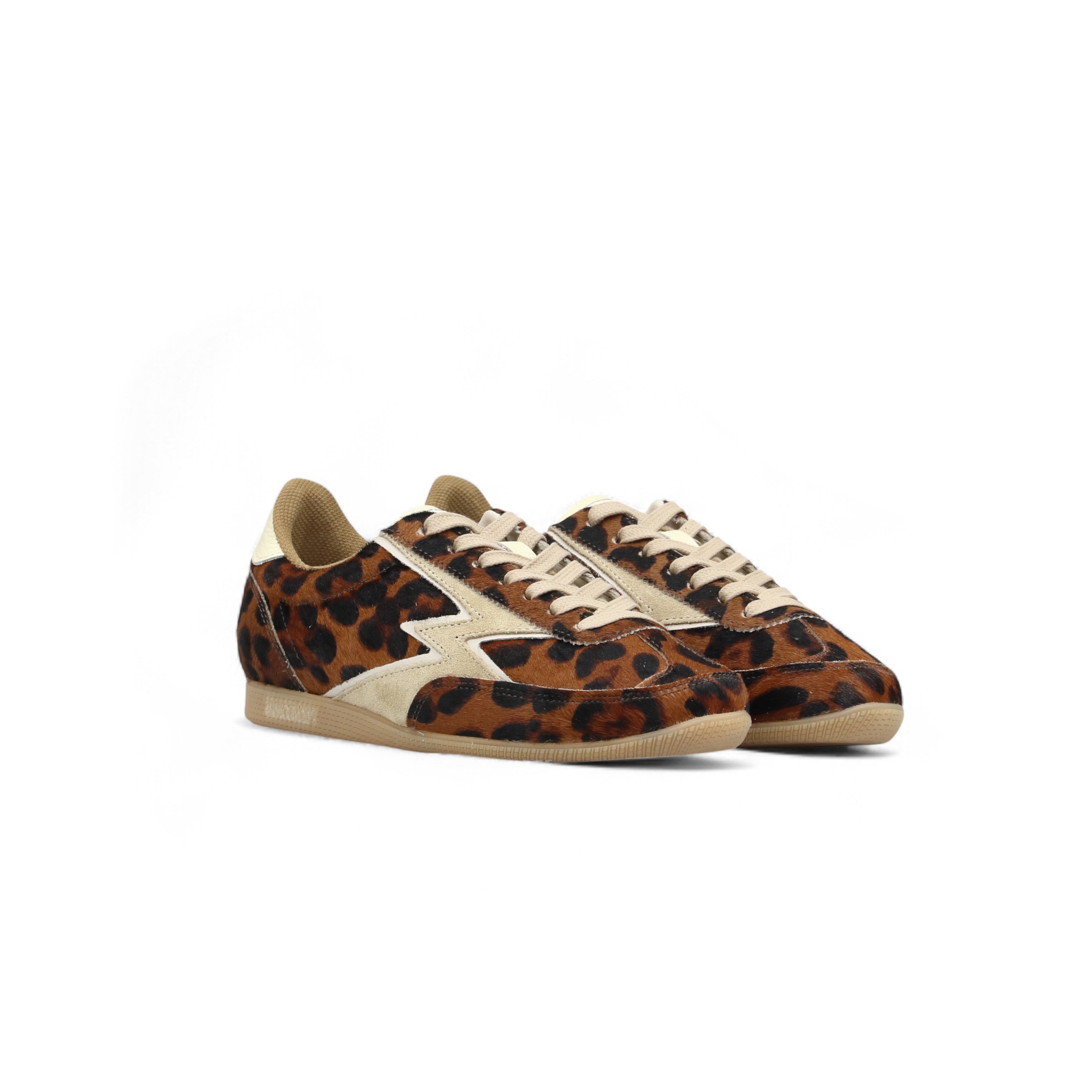Low-top women's sneakers made in Italy in leopard-print pony skin, with sand suede logo and off-white hammered synthetic leather backtab.