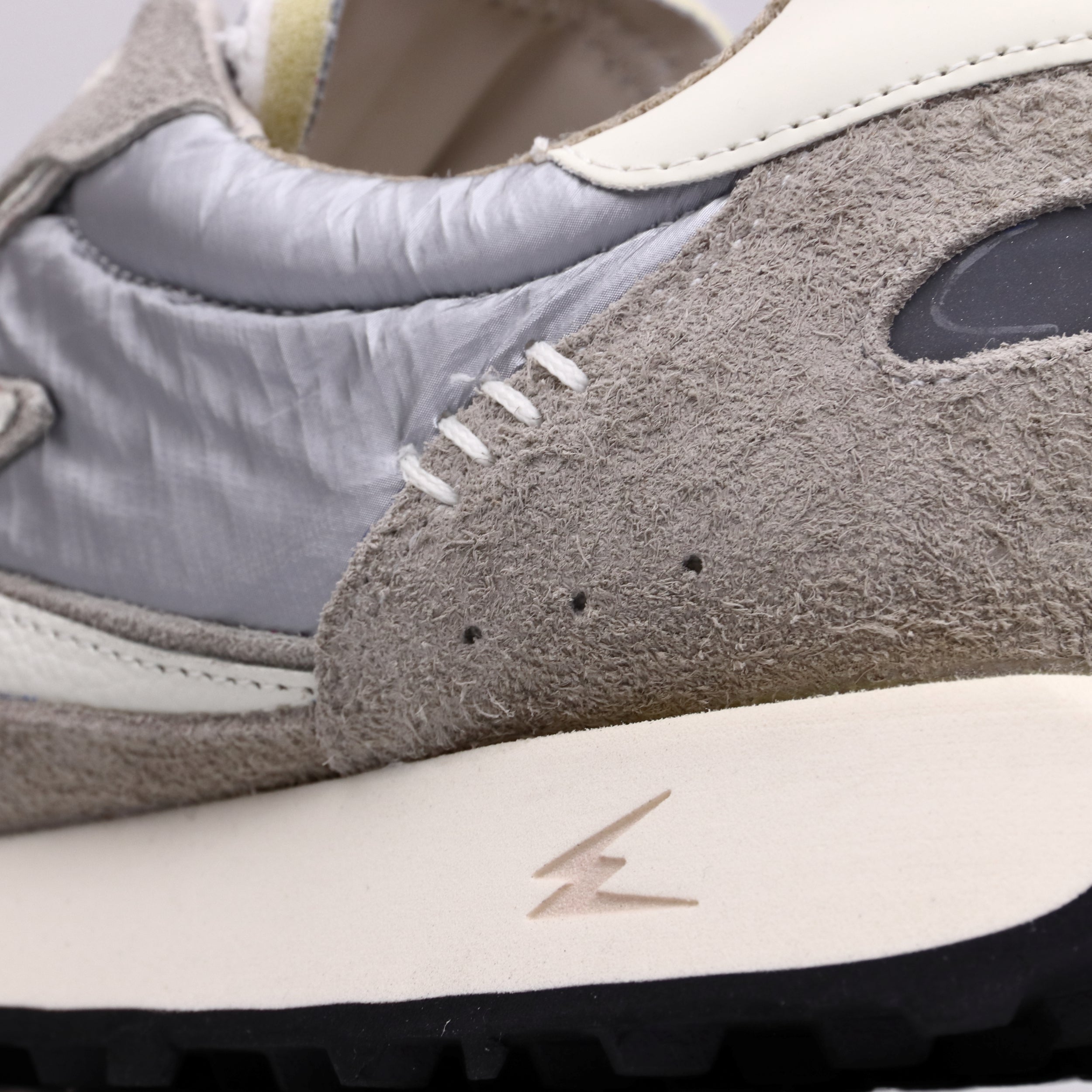 Unisex low-top matt silver sneaker designed in Italy in grey nylon and suede, with off-white rubberised leather details and a white hammered leather logo. - White hammered leather logo - Silver nylon tongue - Two-tone sole in vanilla EVA and black rubber - 3.2 cm high sole - Ivory cotton laces - Off-white rubberized leather backtab - Fabric lining - Canvas insole - Regular fit